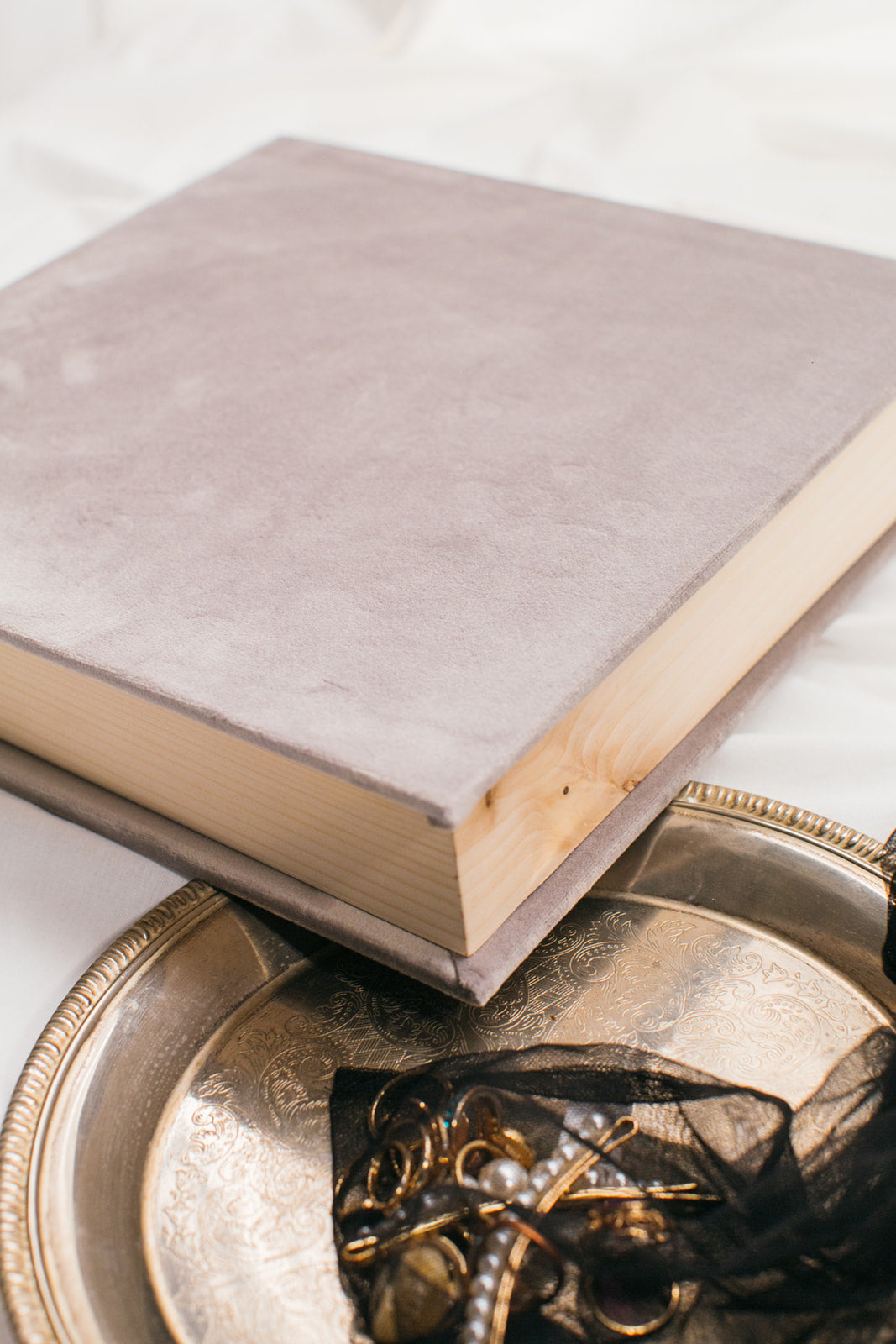 The main compartment is made from locally-sourced pine wood with a D-shaped cut out to aid in lifting the contents. An optional USB drive is available in its own compartment under the book - please see Wood & Fabric Album Box (WITH USB).