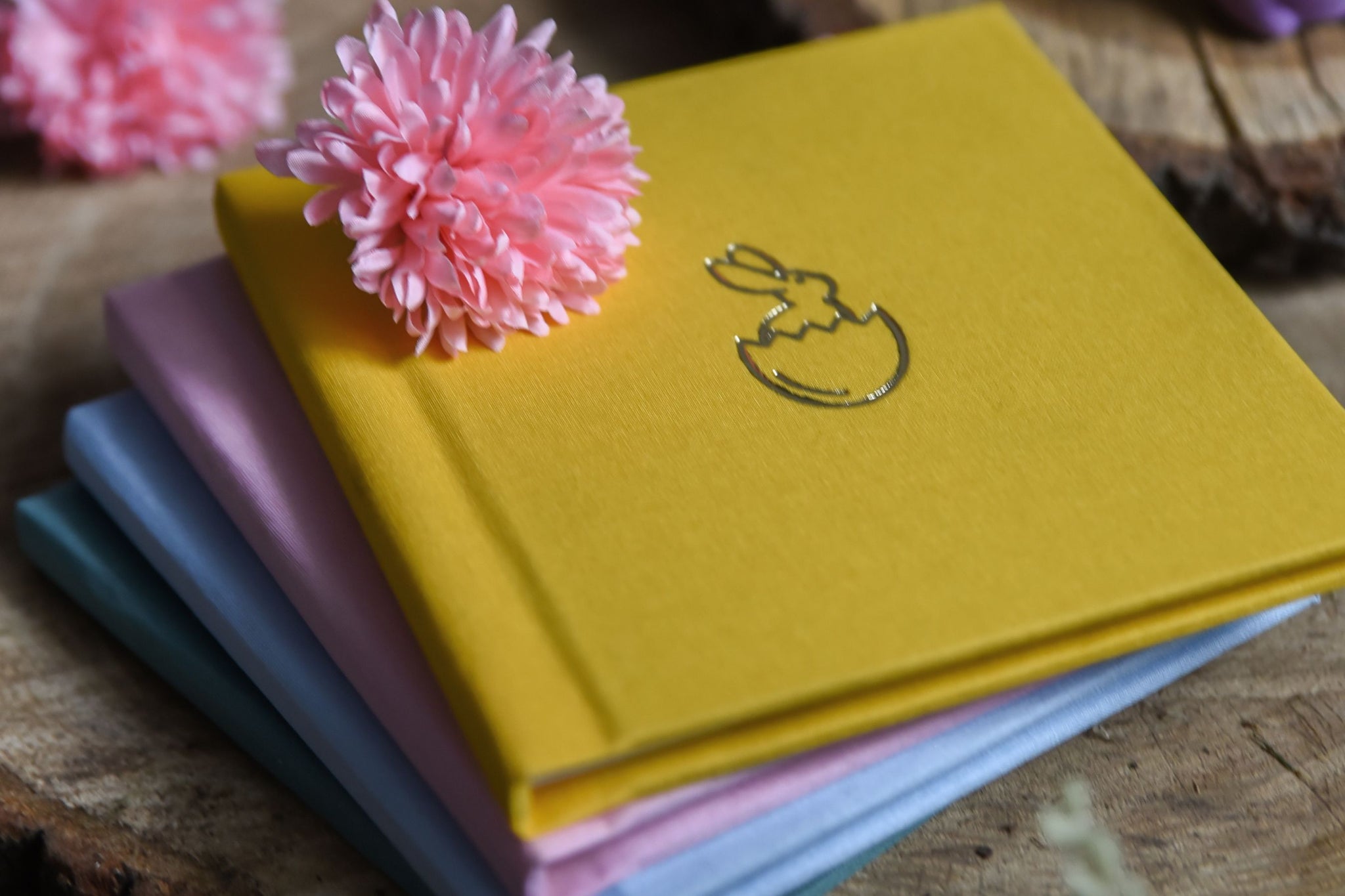 This Easter-themed version of the Pocket AriaBook features a special collection of pastel-colored cover fabrics and a gold embossed Bunny or Easter Eggs. With a minimum page-count of 5 spreads/10 pages.