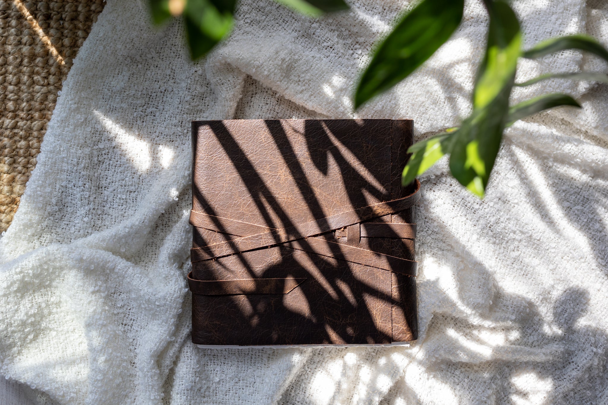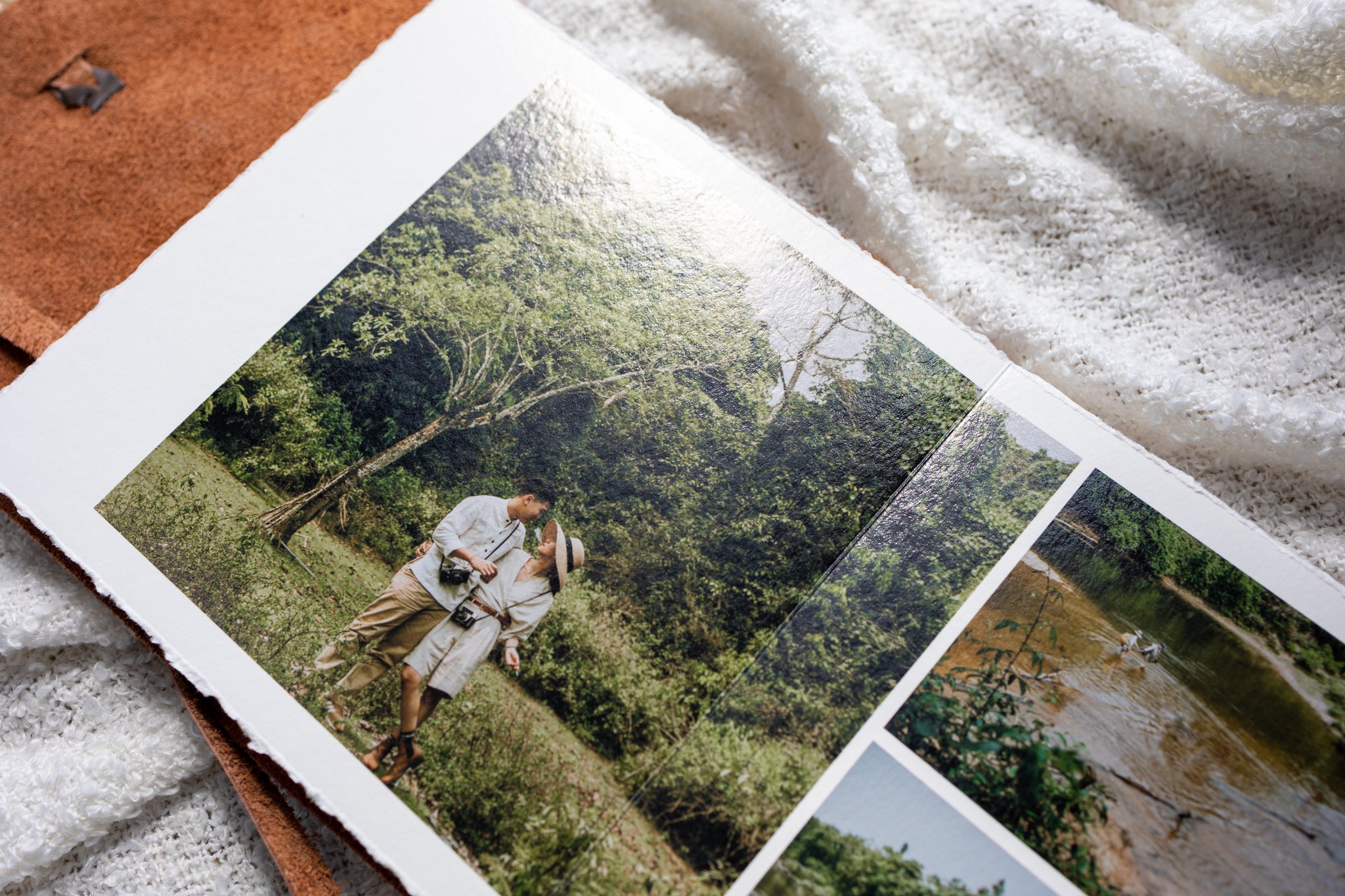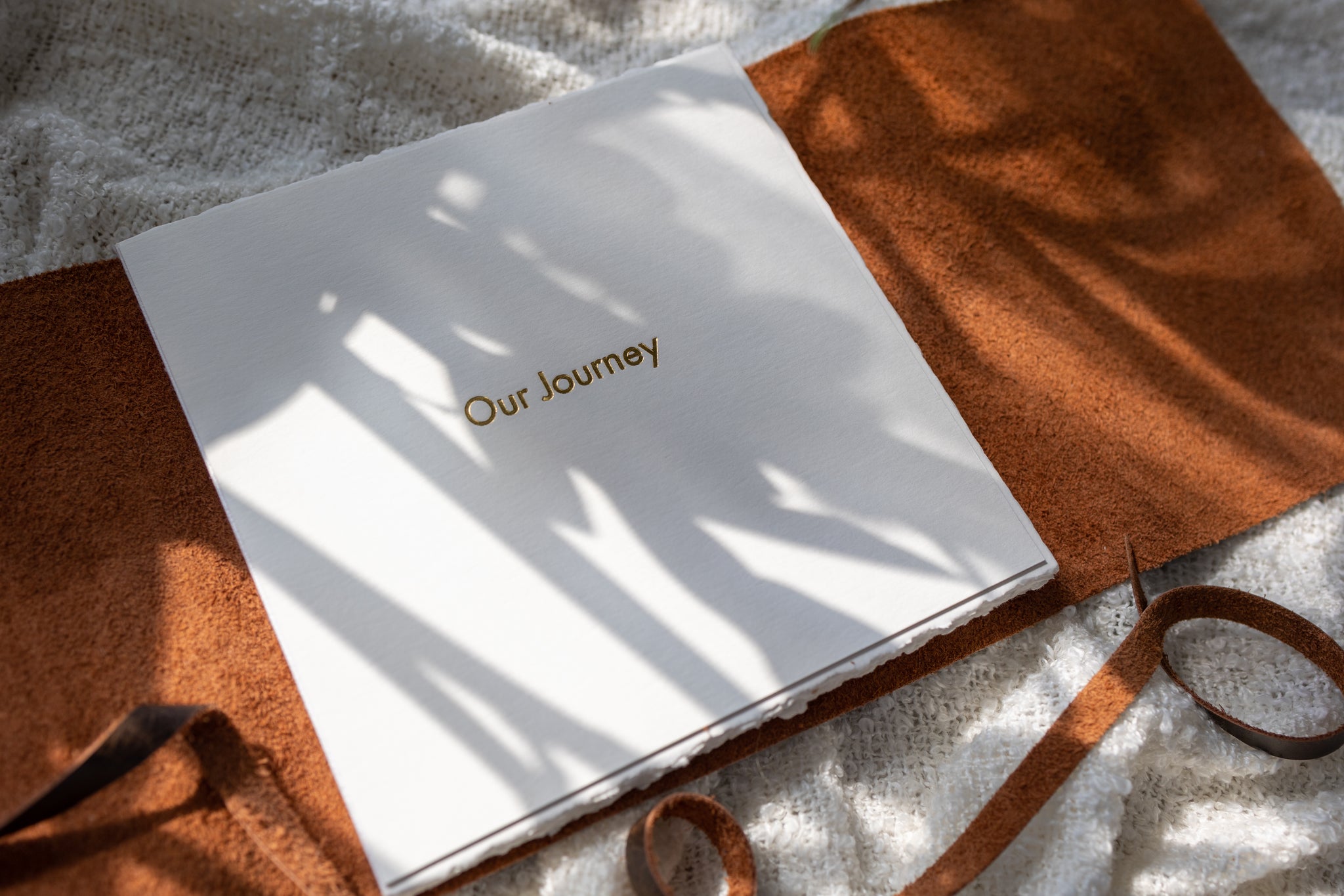 It's unlike anything else - a soft, leather-wrap cover envelops pages of beautifully hand-torn fine art prints - front page embossed in gold. A rustic leather strap closure winds around to finish the look. The Journal cover is unattached to the block of pages.
